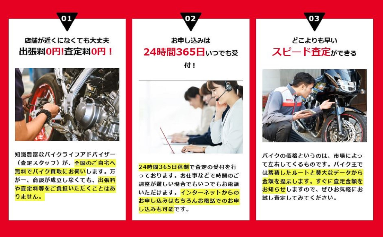 バイク王は全国対応と24時間受付の利便性に優れる一方、レッドバロンは店舗での対面サービスに強みがあります。あなたの住んでいる地域や希望する査定方法に応じて、より便利な方を選ぶとよいでしょう。